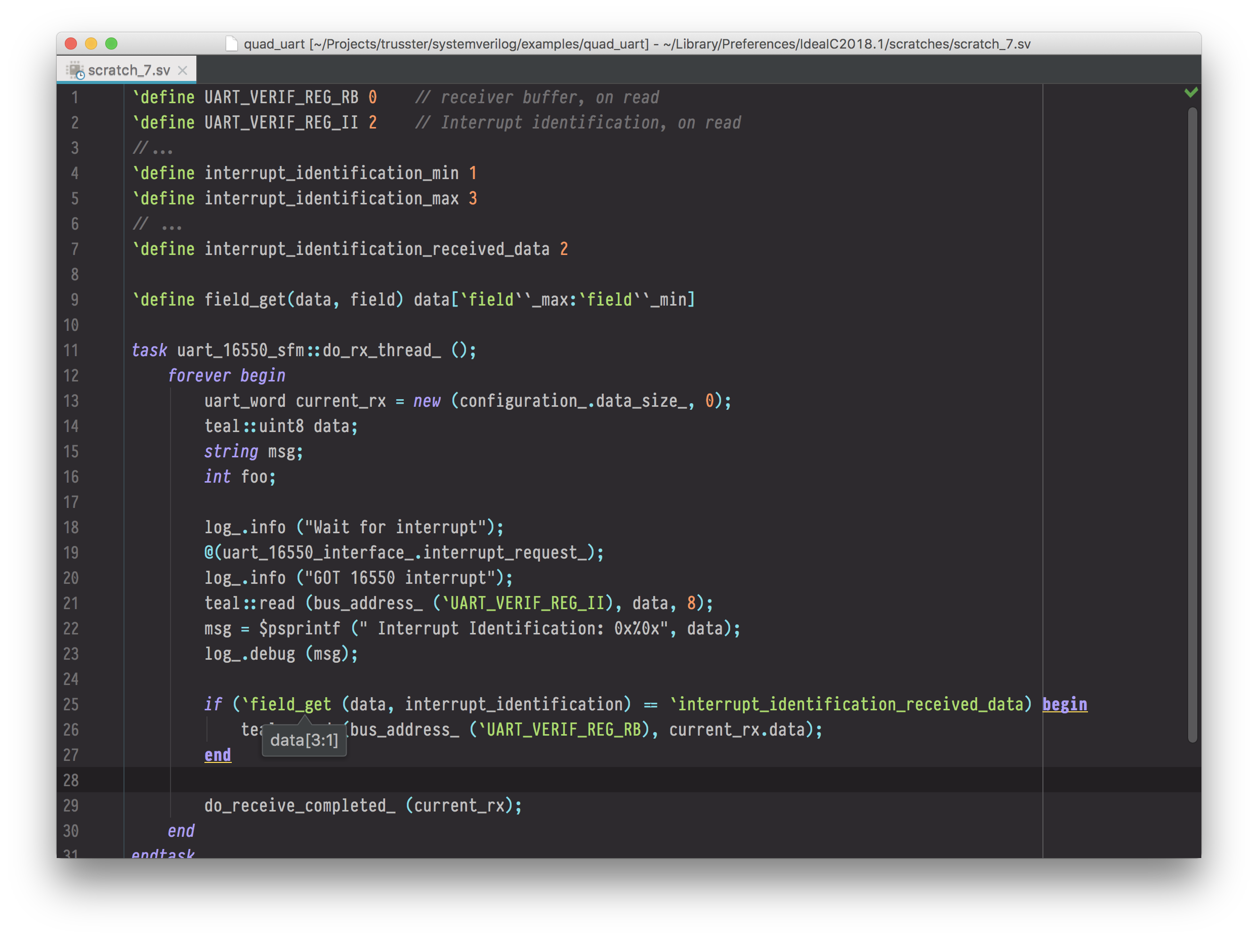 In this example field_get is expanded in multiple steps since the first define contains other defines created from text merges. The result is "register[3:1]".